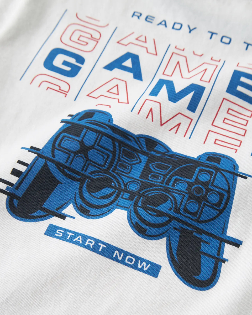 T-SHIRT BRIGHT WHITE ΒΑΜΒΑΚΕΡΗ ΑΝΕΤΗ ΜΕ ΜΙΚΡΟ ΤΥΠΩΜΑ ΜΠΡΟΣΤΑ ΜΠΛΕ & ΜΕΓΑΛΟ ΤΥΠΩΜΑ ΜΠΛΕ (GAMES)ΣΤΗΝ ΠΛΑΤΗ