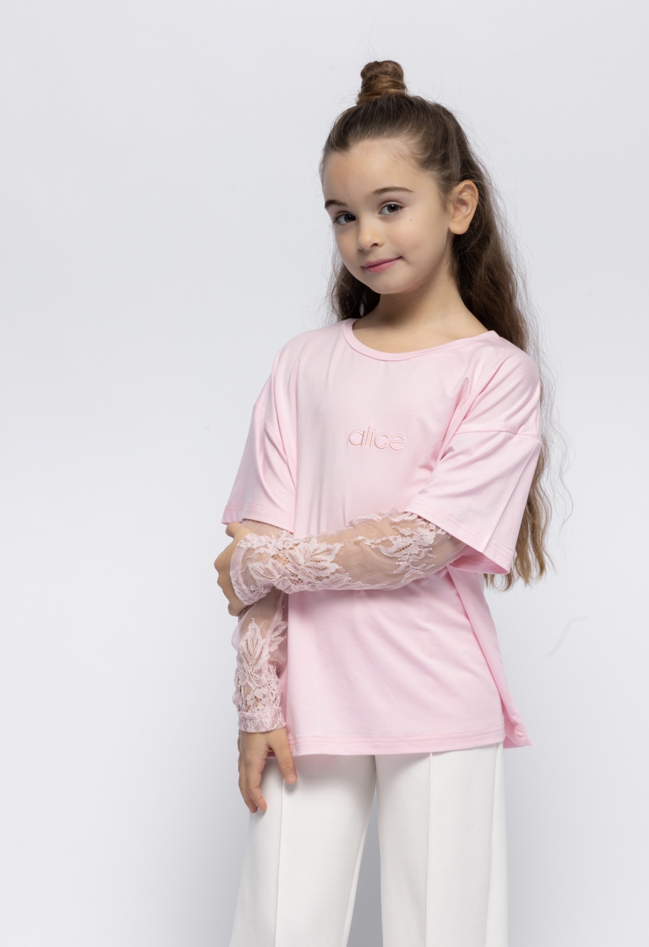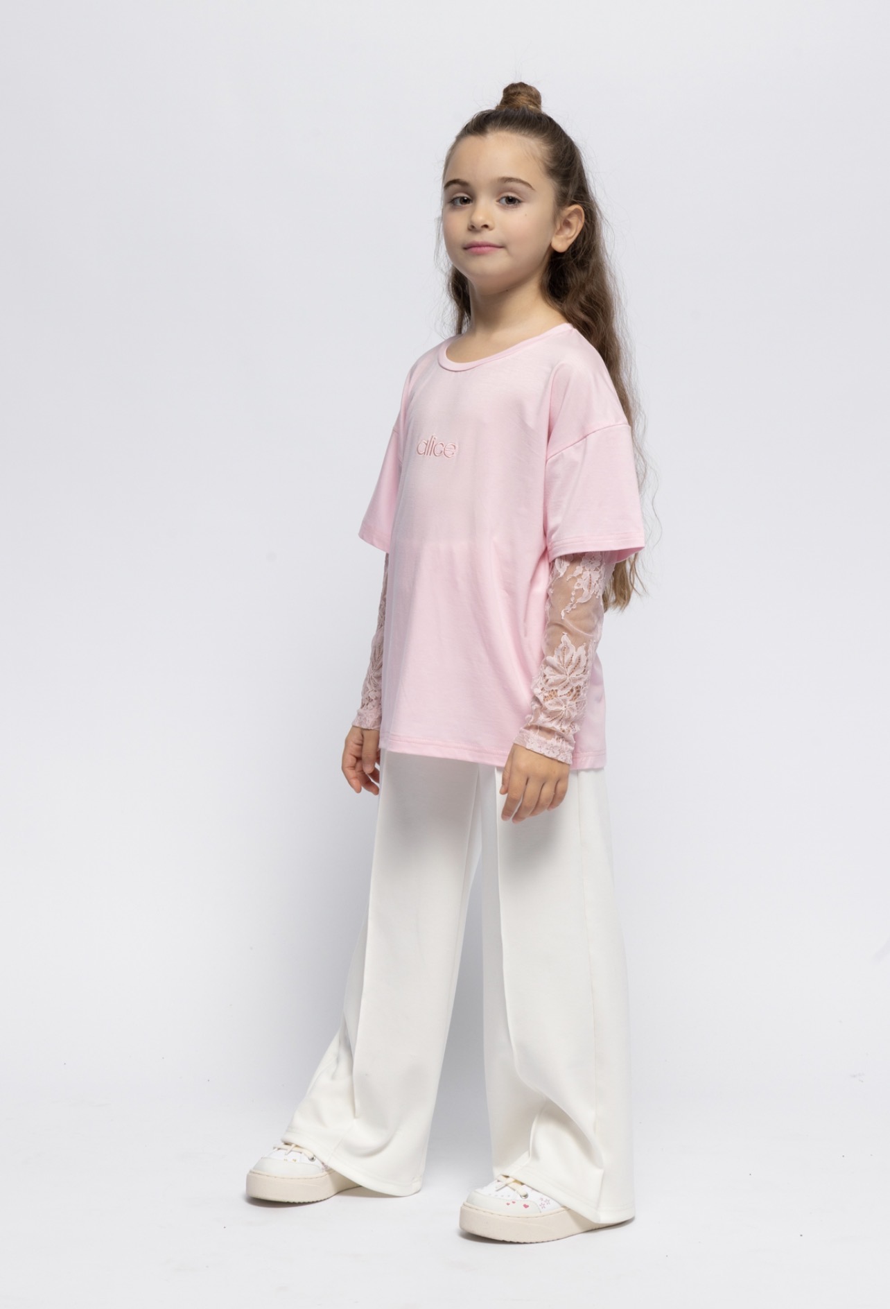 Μπλούζα σε oversized γραμμή με κέντημα μπροστά και κοντό μανίκι. Λεπτομέρεια με δεύτερο μανίκι από δαντέλα.