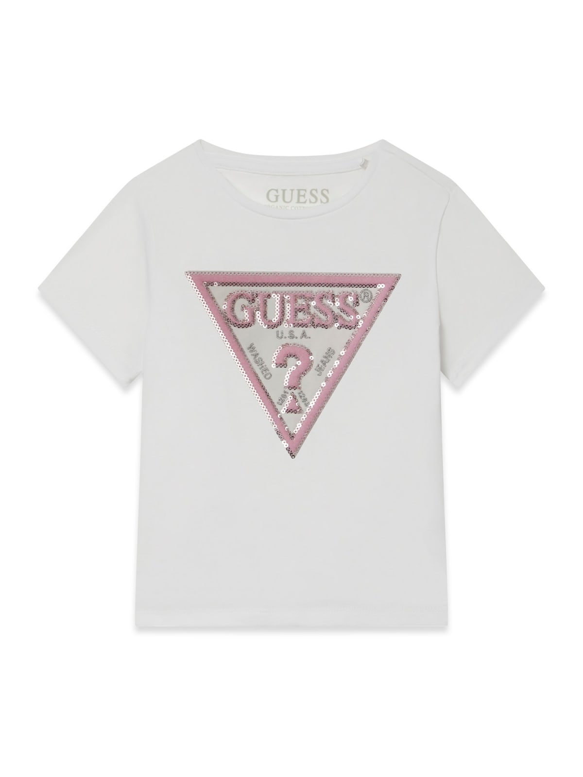 ΜΠΛΟΥΖΑ ΚΟΝΤΟΜΑΝΙΚΗ ΜΕ ΧΡΩΜΑ Pure White & ΜΕ ΤΥΠΩΜΑ GUESS ΜΕ ΤΟ ΚΛΑΣΣΙΚΟ ΣΧΕΔΙΟ ΤΡΙΓΩΝΟ ΜΠΟΣΤΑ