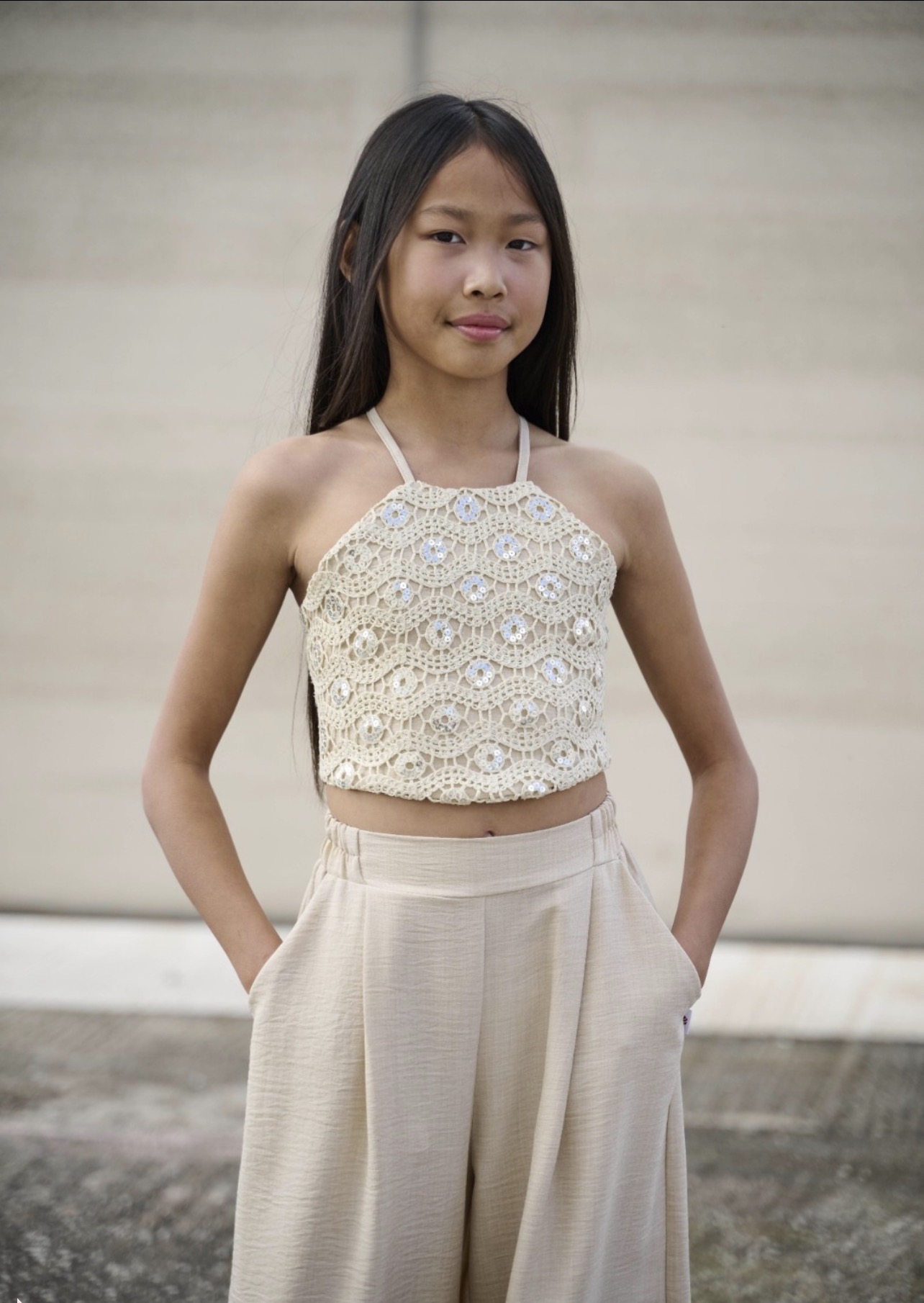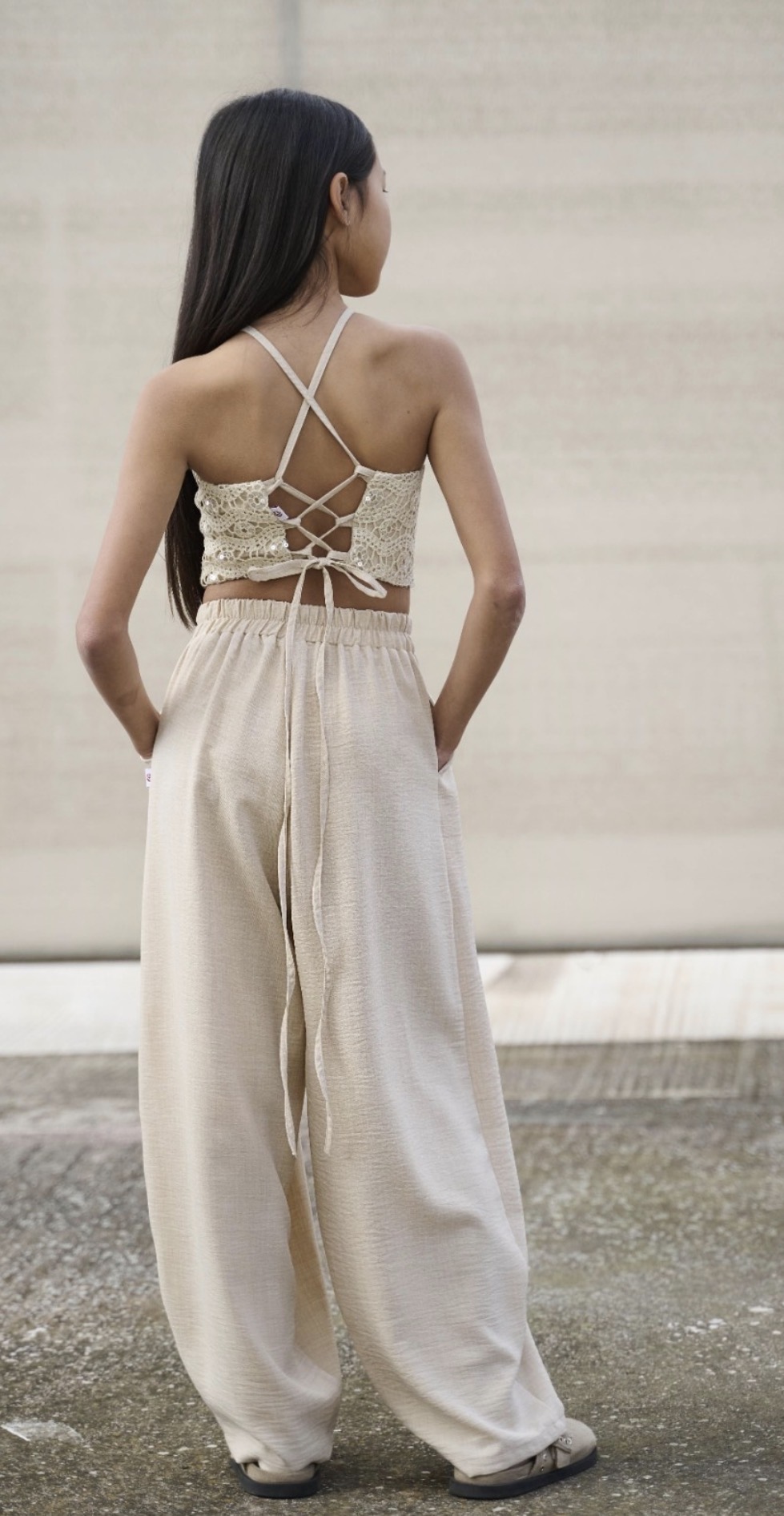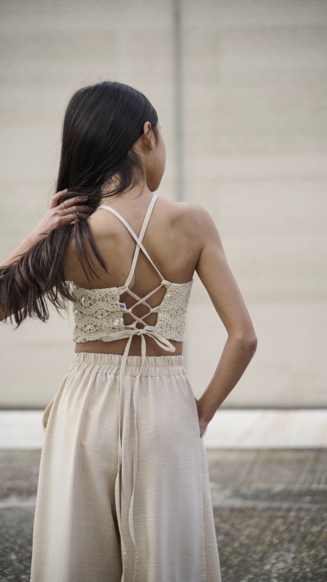 Σετ μπεζ τοπ με δαντέλα & παγιέτες, ανοιχτή πλάτη με δέσιμο χιαστί & παντελόνα σε carrot γραμμη με πιέτες & πλαϊνές τσέπες