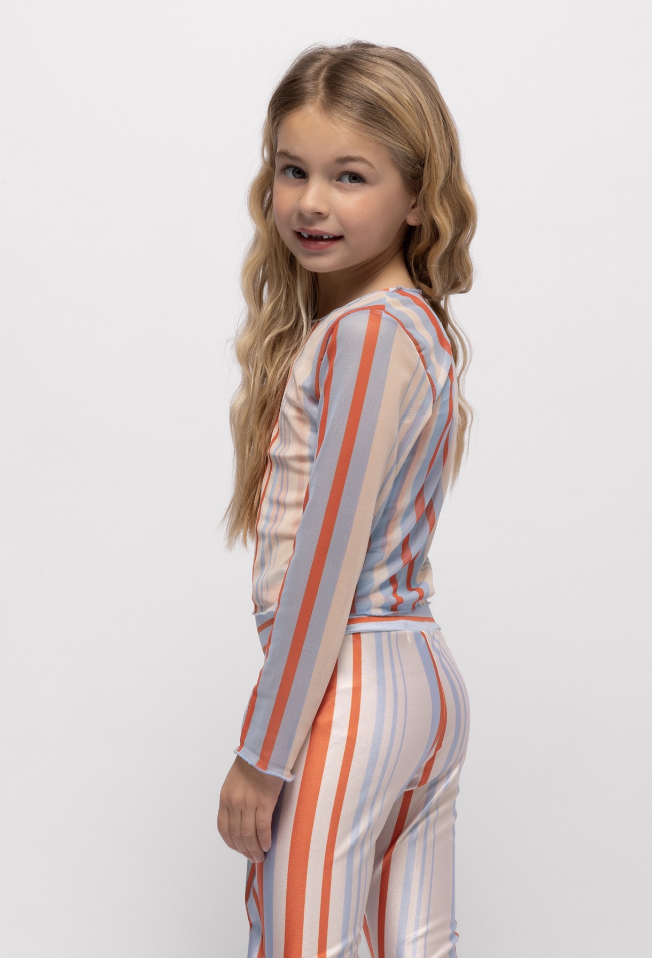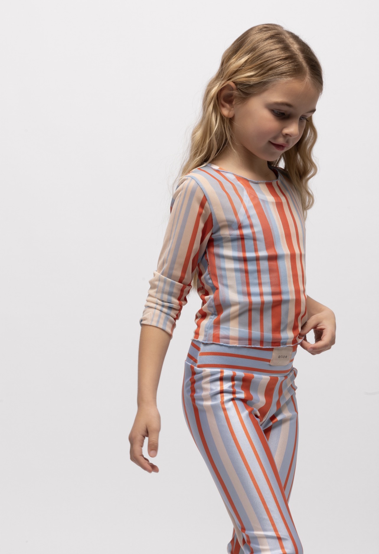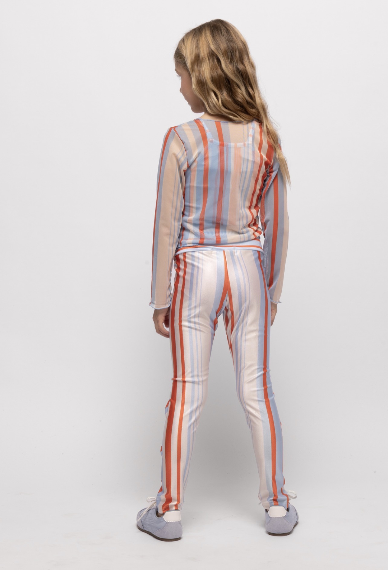 Σετ που αποτελείται από 3 τεμάχια, κολάν λύκρα γυαλιστερό ψηλόμεσο, με μπάσκα και διακοσμητικό υφαντό στοιχείο. Τοπ λευκό με τιραντάκια και μπλούζα από τούλι με μακριά μανίκια τυπωμένο στο ίδιο ριγέ print του κολάν