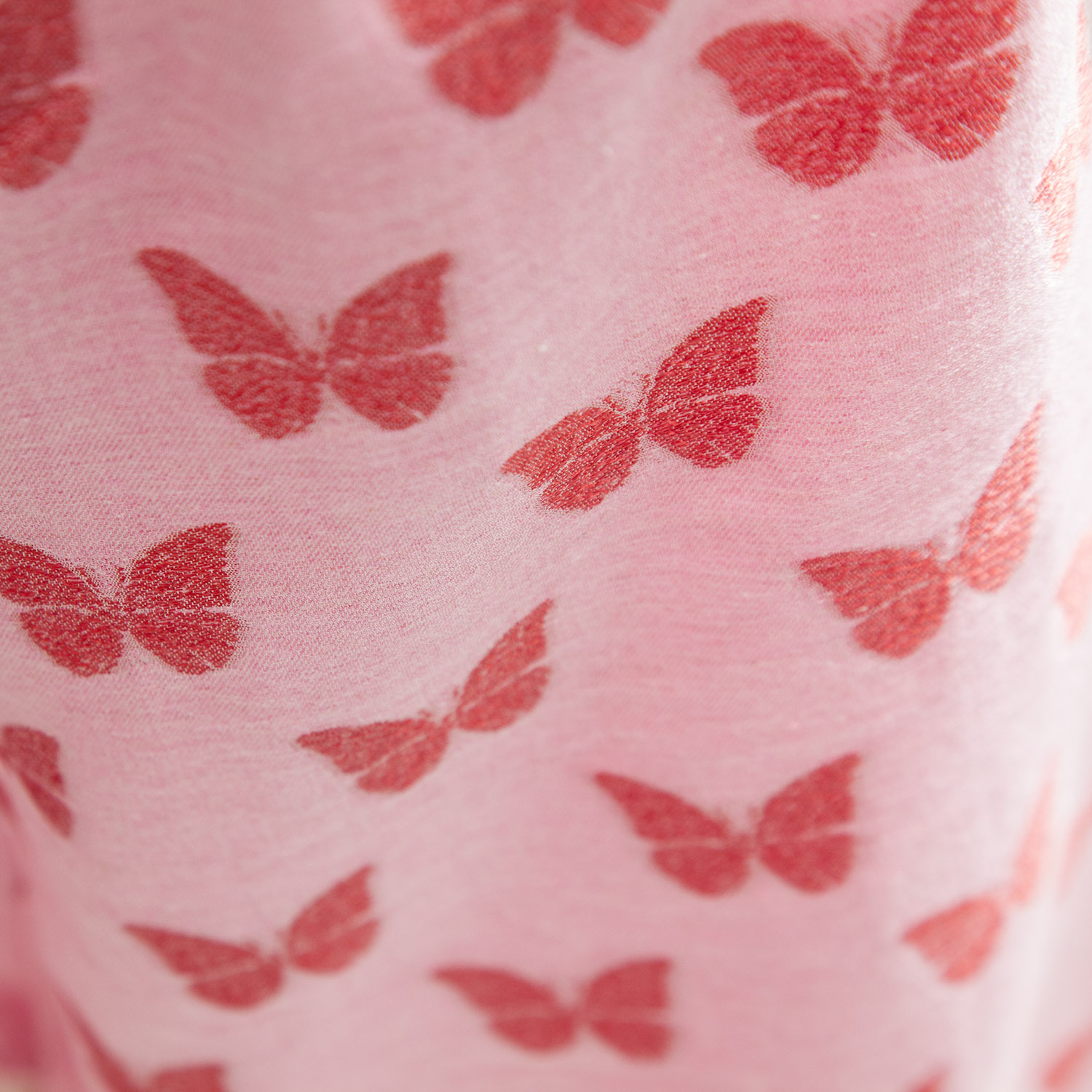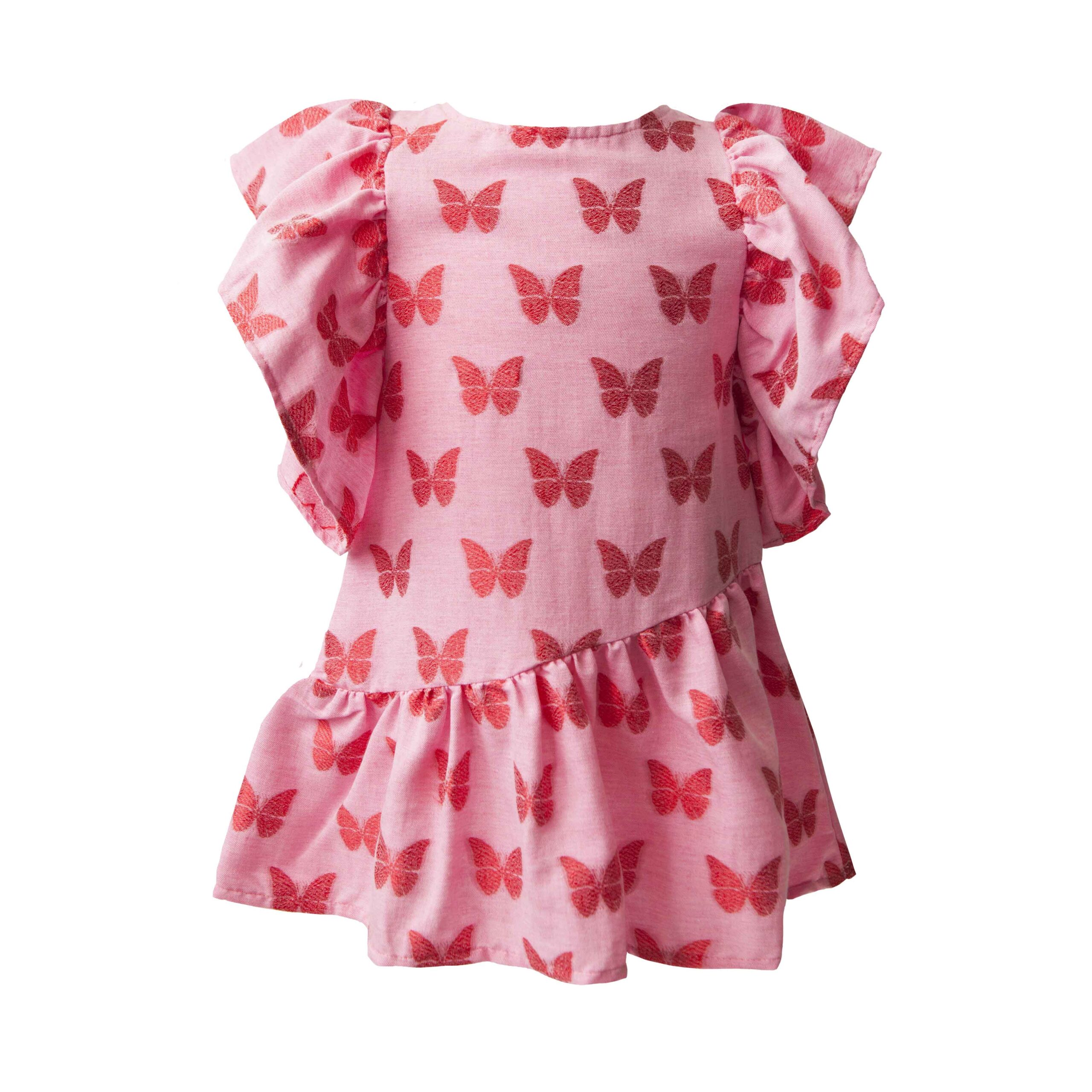 Φόρεμα με μεγάλα βολάν στα μανίκια & στο τελείωμα. Έχει στρογγυλή λαιμόκοψη & μοτίβο πεταλούδες σε ροζ και κόκκινο χρώμα.. Άνοιγμα σε σχήμα σταγόνας στην πλάτη & κλείσιμο με κουμπί. Δώρο λεπτή κορδέλα για τα μαλλιά.