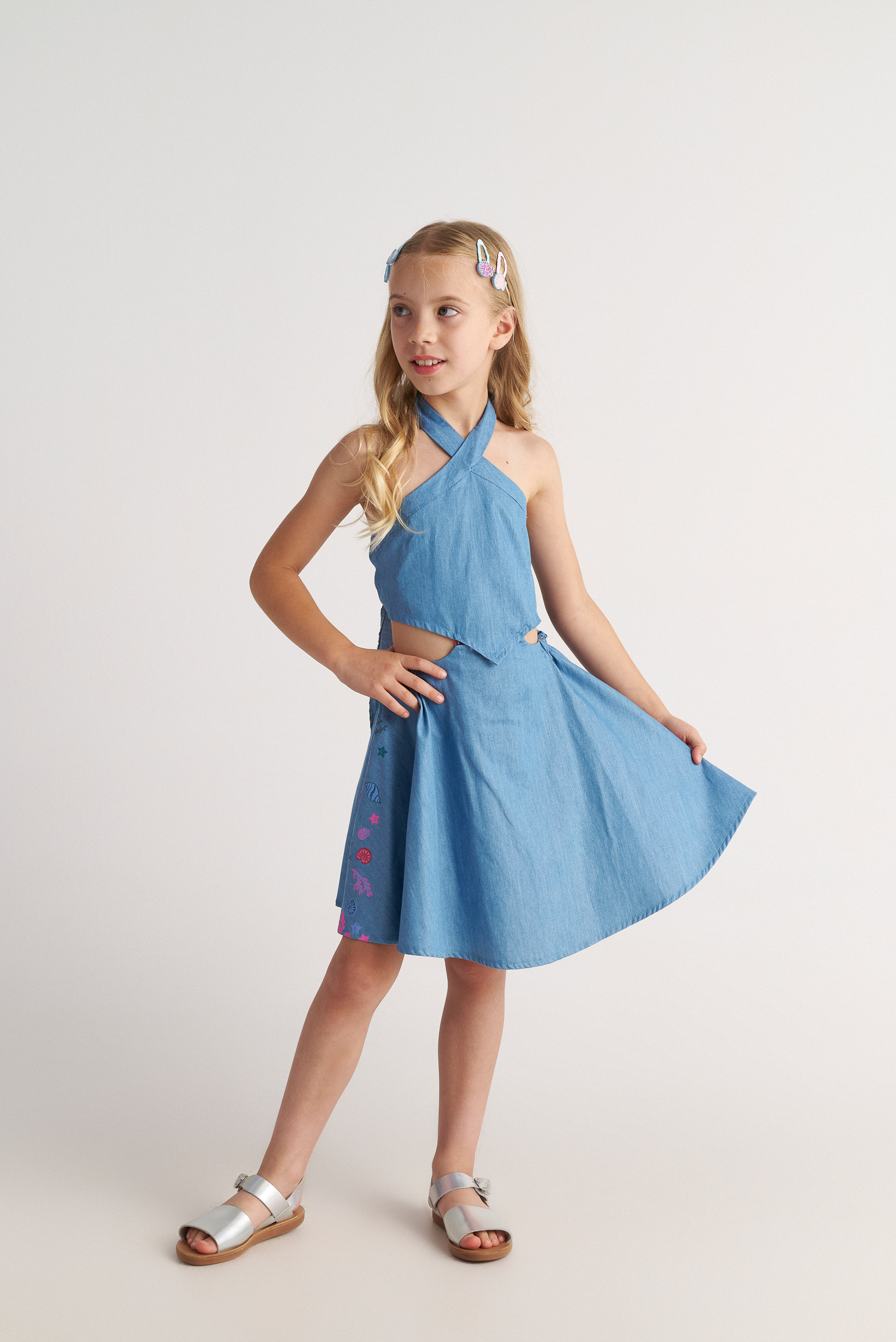 ΦΟΡΕΜΑ ΜΠΛΕ ΜΕ ΚΟΧΥΛΙΑ ΣΤΟ ΠΛΑΙ ΚΟΚΚΙΝΑ Κ ΡΟΖ ΣΤΗ ΦΟΥΣΤΑ